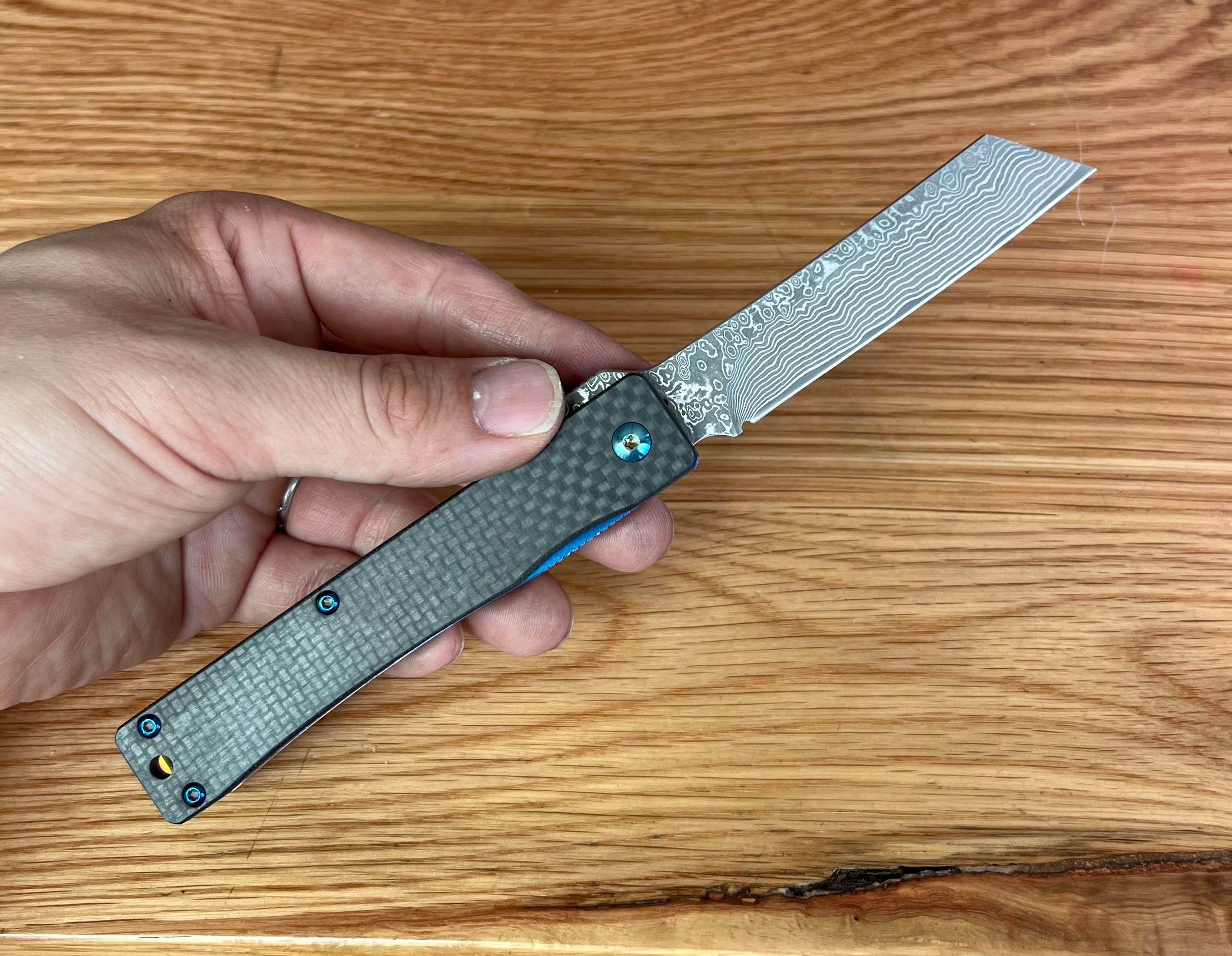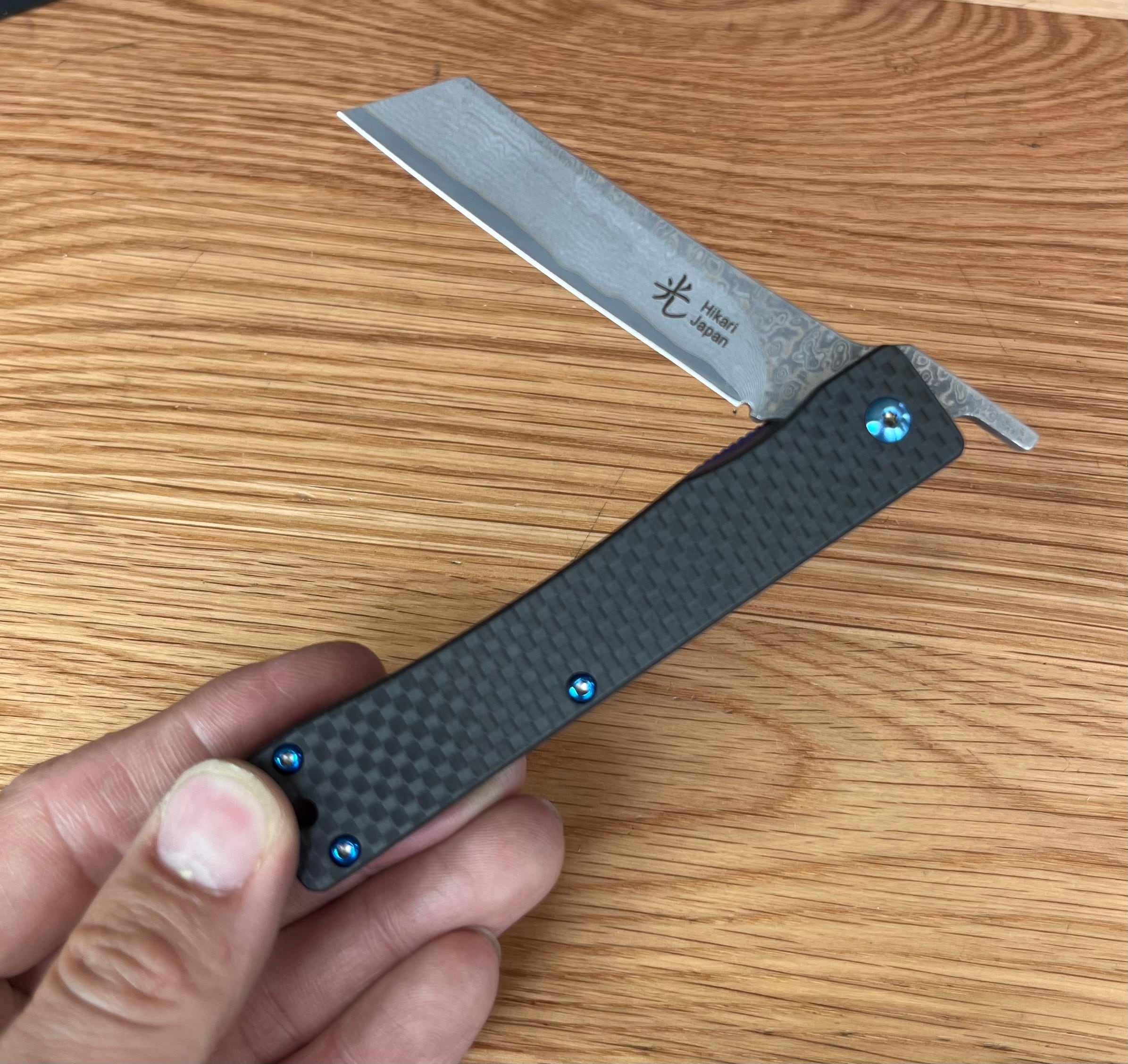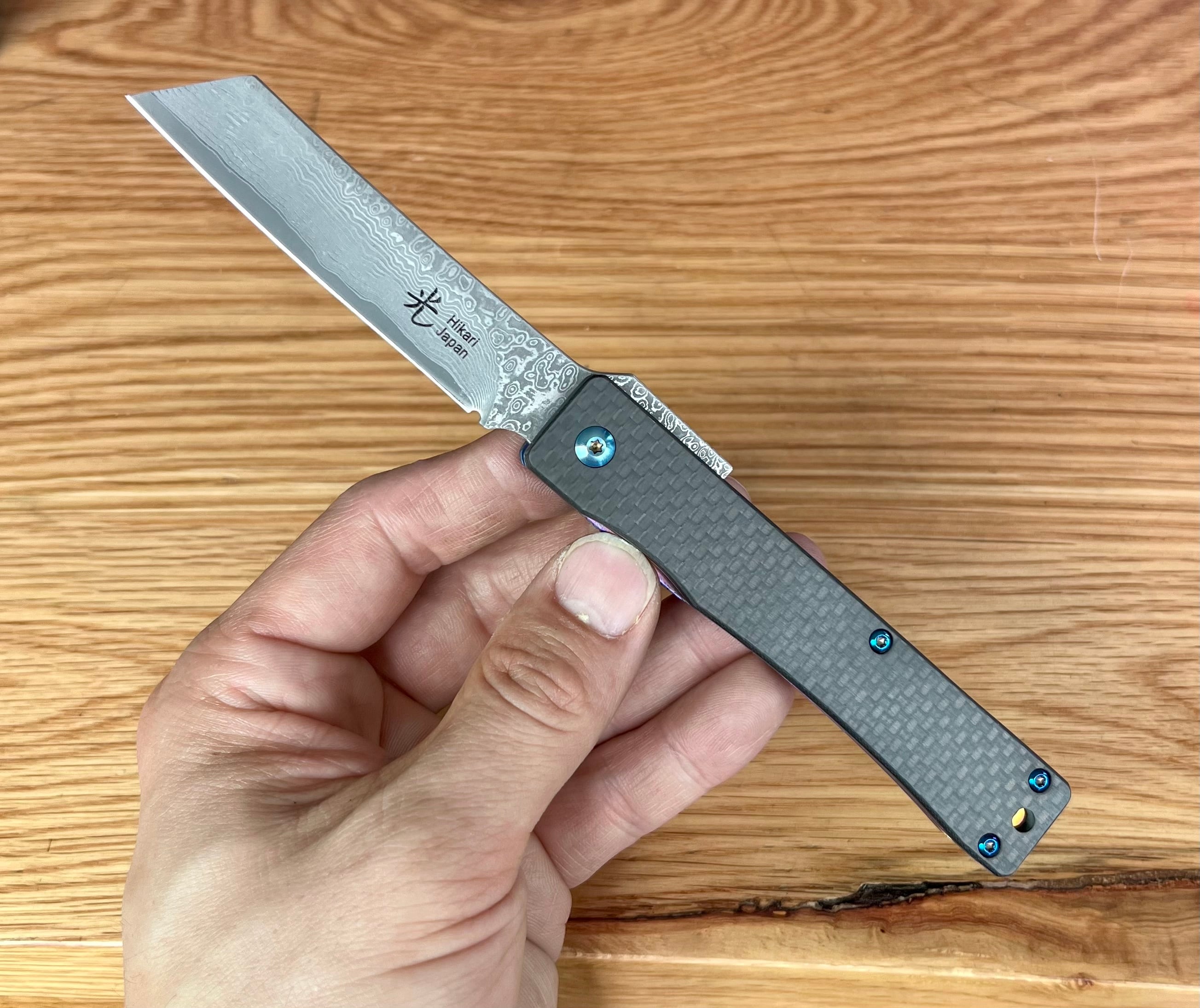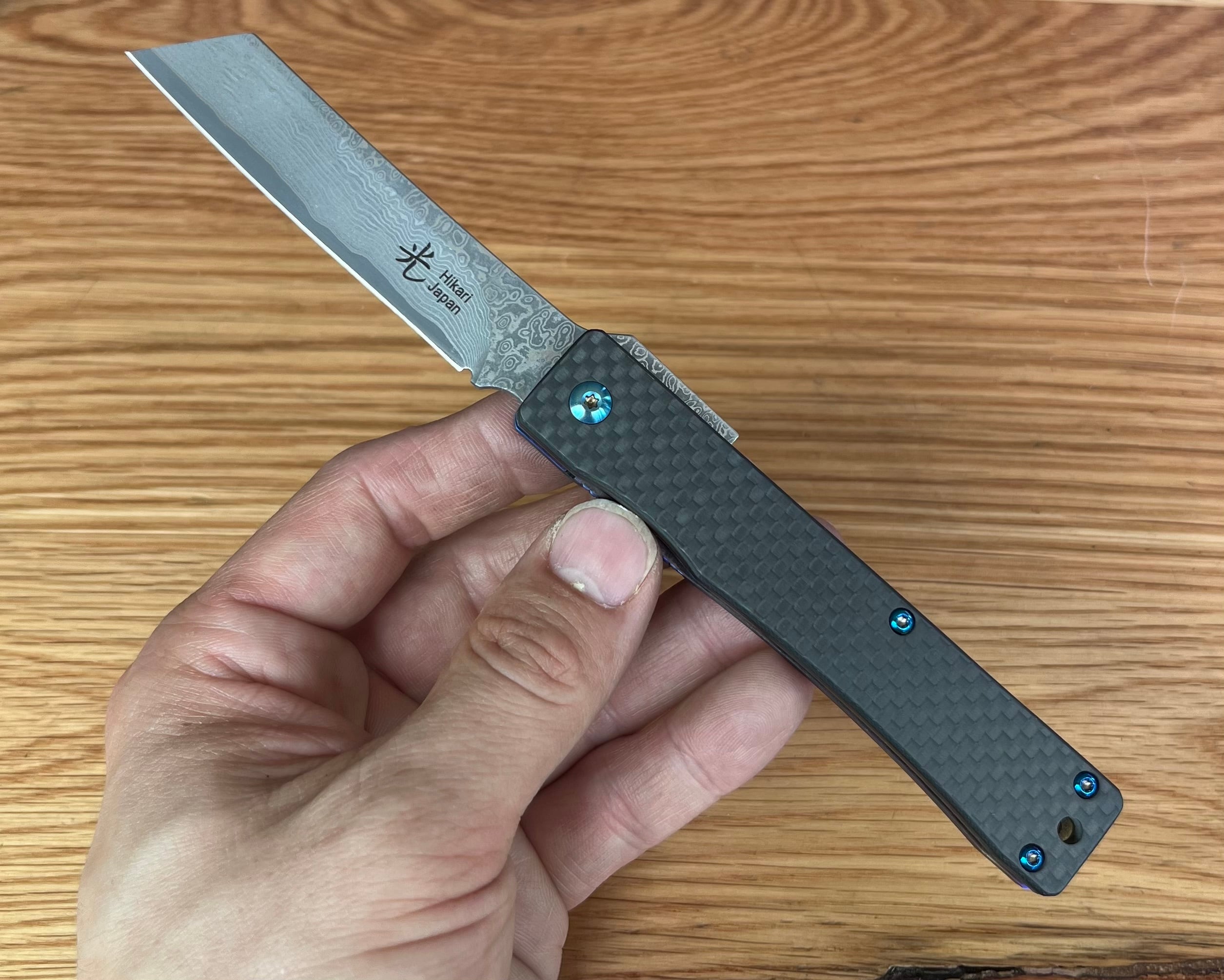 特注モデル「光JAPAN カーボンダマスカス肥後ノ神」は、日本の伝統技術と現代の工芸技術が融合した特別な逸品です。高品質な削り出しカーボンハンドルとダマスカス鋼を融合させた日本伝統の肥後形です。海外ではたいへんな人気モデルとなり初期ロットは即完売しました。