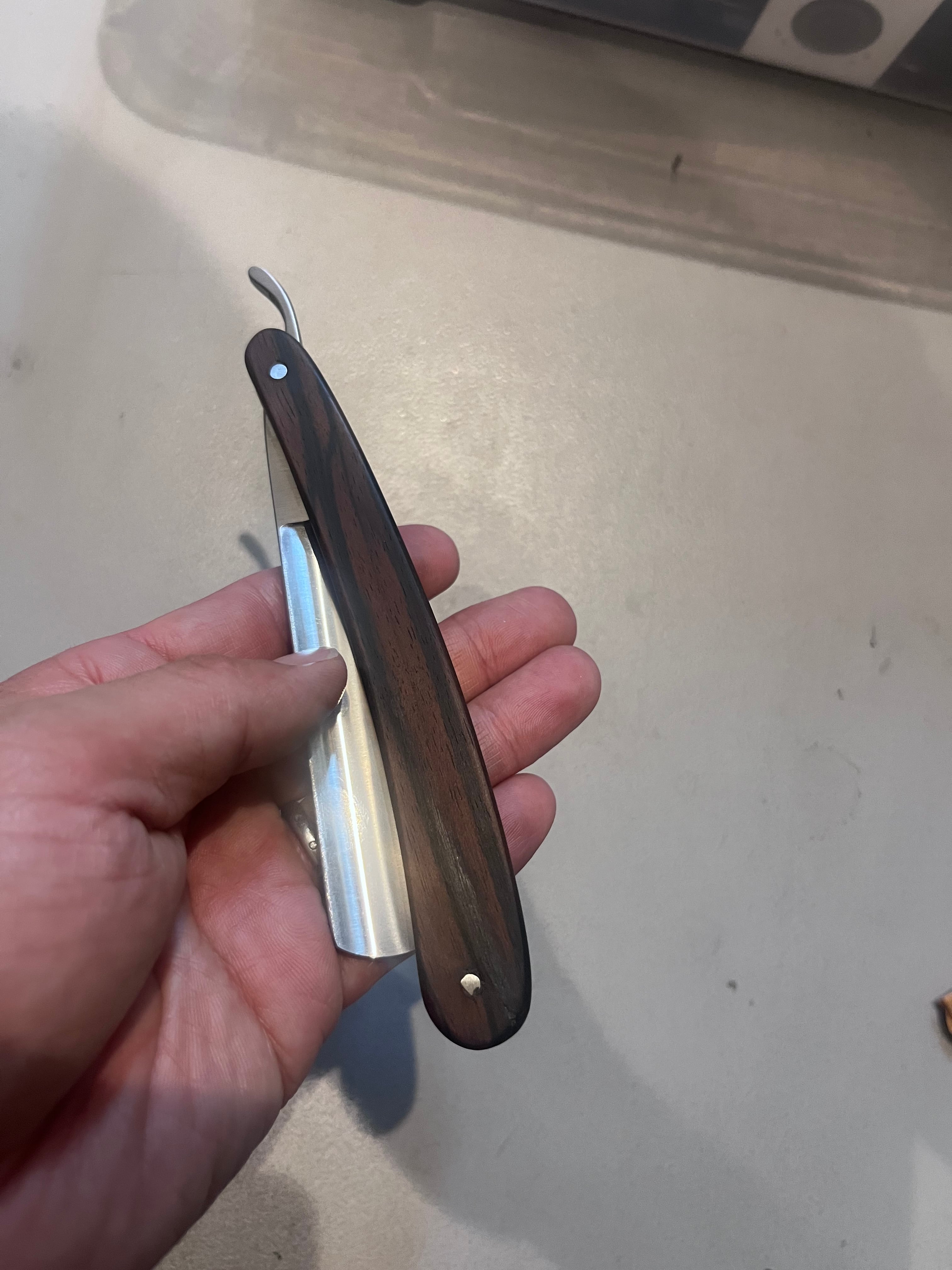 青森の名門刃物鍛治 ニ唐刃物鍛造所の名工が手がけた切れ味抜群のレザーカミソリ。海外のバイヤーより「髭が濃い私たちでも使えるものはないか、、」との声を受け、特別にあつらえられた逸品です。安来鋼青紙を鍛造し、丁寧に研ぎ上げられたブレードは切れ味鋭く髭を剃り上げます。手作業の鍛造にて作られる本品は大変に時間がかかるため、このたび残念ながら廃盤となりました。本品は特注の縞黒檀で、サンプルとして一本だけ残っていたものです。
