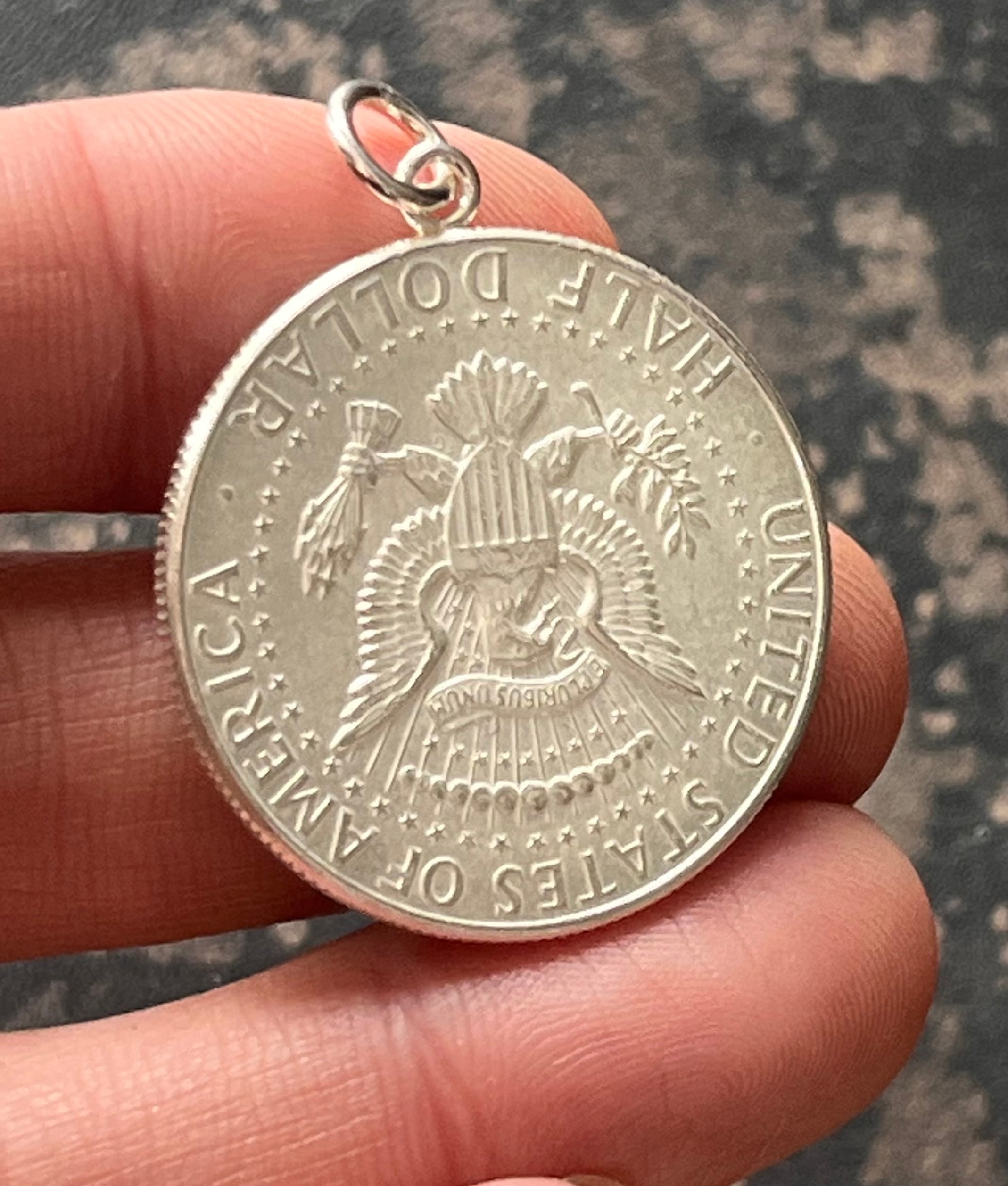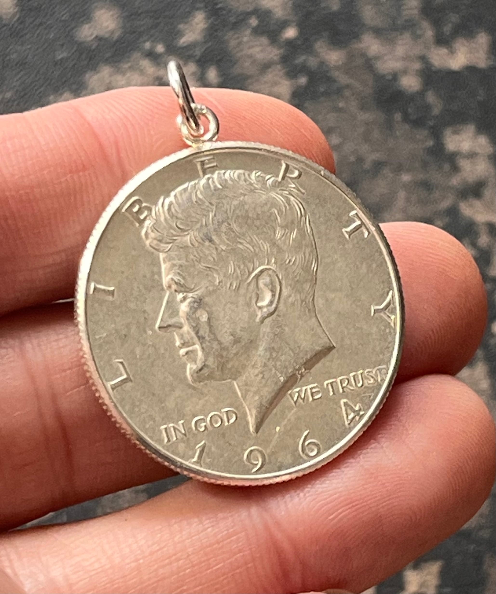本物の1964ケネディハーフダラー銀貨を使いペンダントトップに加工したものです。銀が値上がりして美品のケネディ1964が一枚3000円ほどになってしまいました。ぎんのろう付けも1500円ほどかかります。そのため上代は8000円以下では売れない商品ですが、長期在庫が大量に出てきたので、処分価格で販売します。チェーンをつけて転売にもおすすめです。無くなり次第終了です。