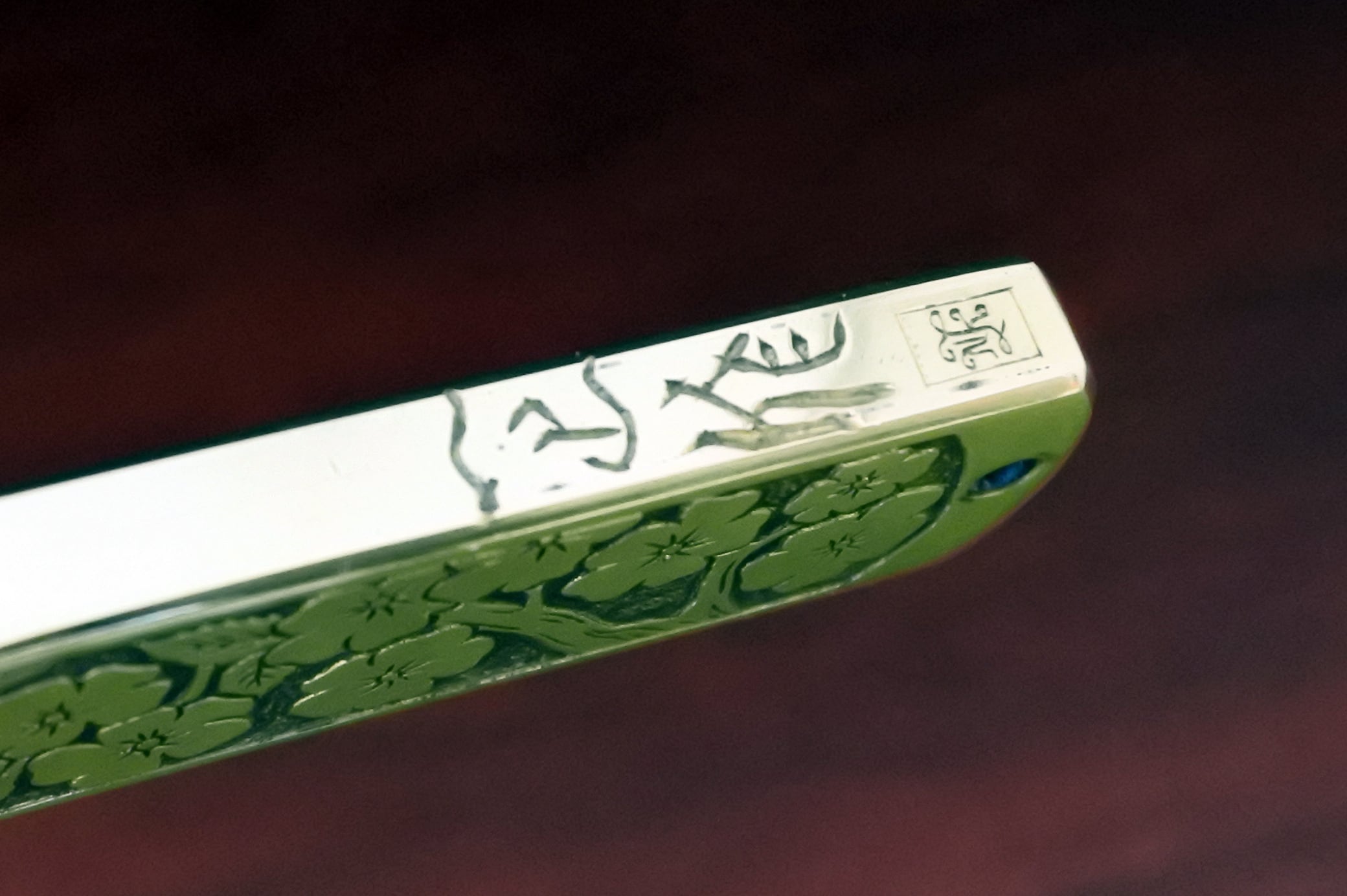 刀匠として知られる町田一止氏の手打ち鍛造のダマスカス肥後カスタムナイフ。ハンドルの両側にイングレーバー小池憲男氏の手彫りの彫刻が入る最高級モデル。二度と作られない至高のカスタムナイフです。