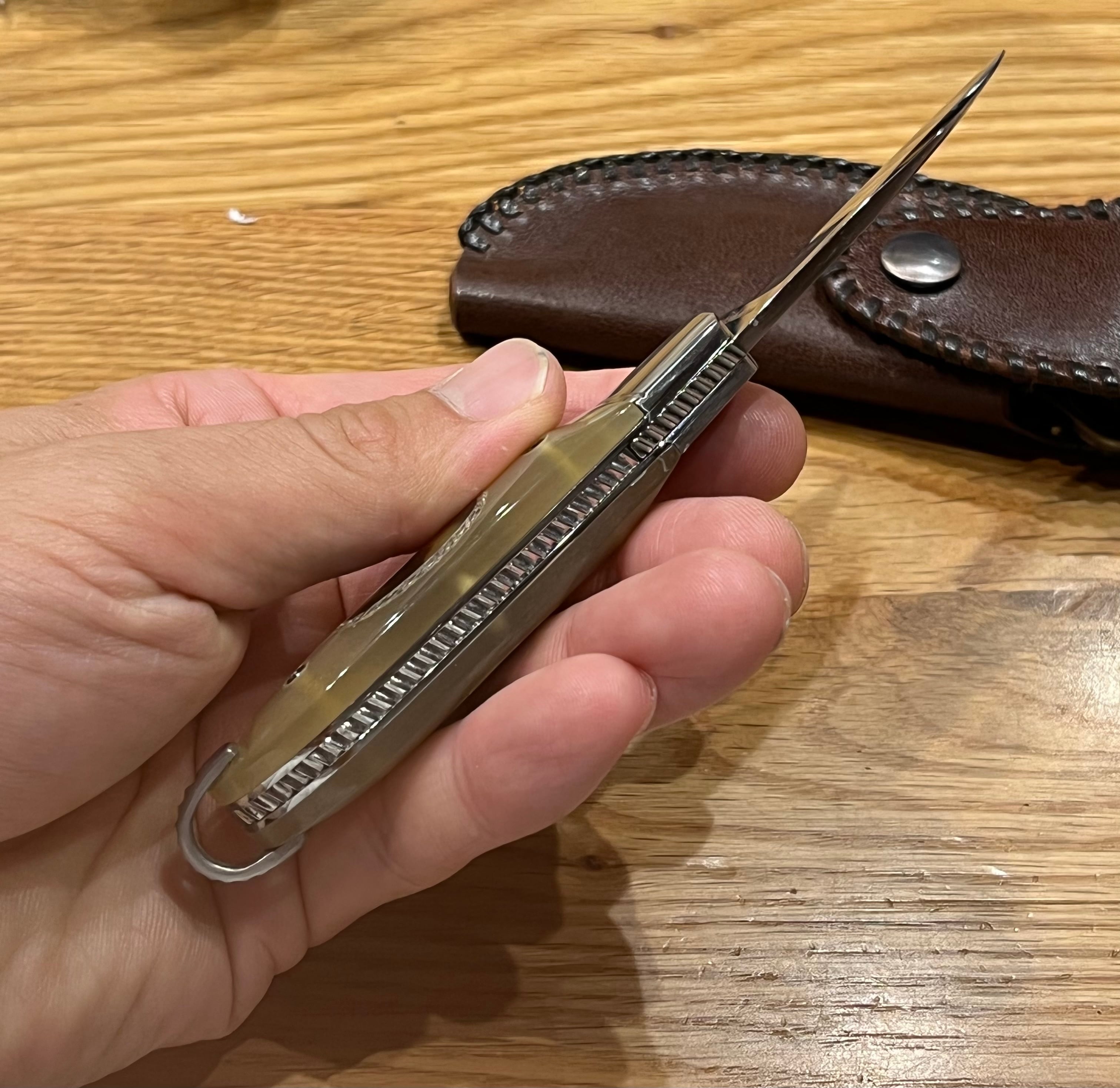 世界的なカスタムナイフメーカー宮前敏行氏の最高級カスタムフォールディングナイフ。極上のハニーホーンと銀線のインレイなど大変に見どころの多いナイフです。ブレードはコアレスダマスカス。ロックはスリップジョイント。心地よいロックは病みつきになります。(天然素材を使用しておりますので、色合いが若干ことなる場合がございます)