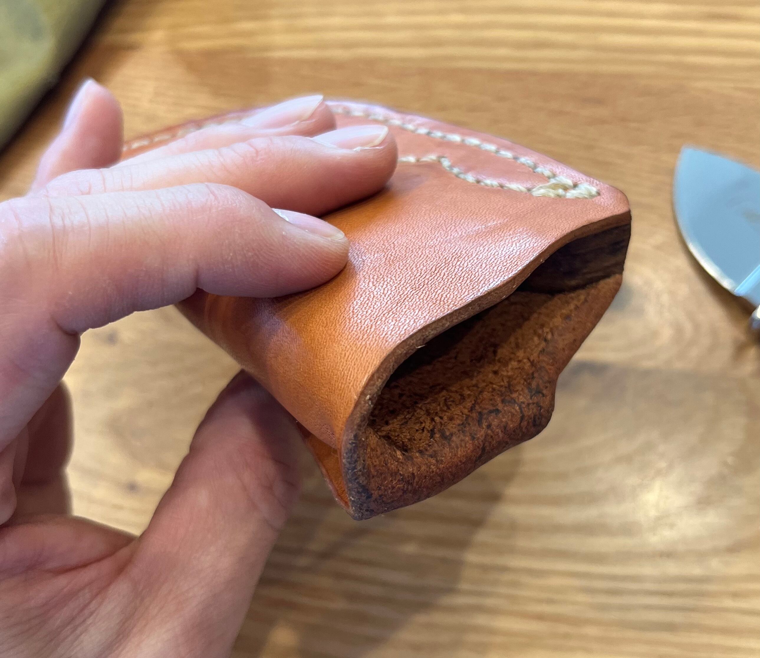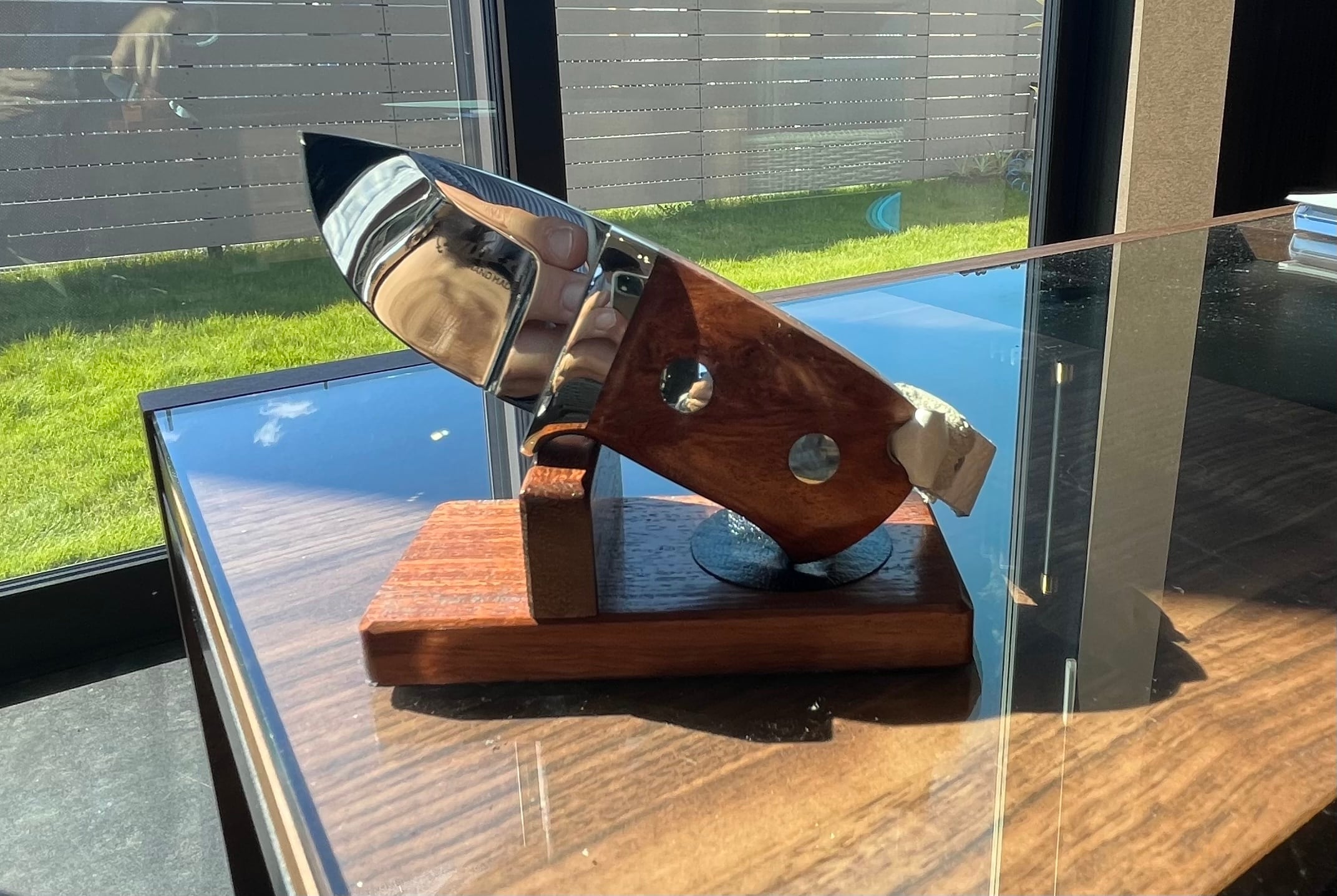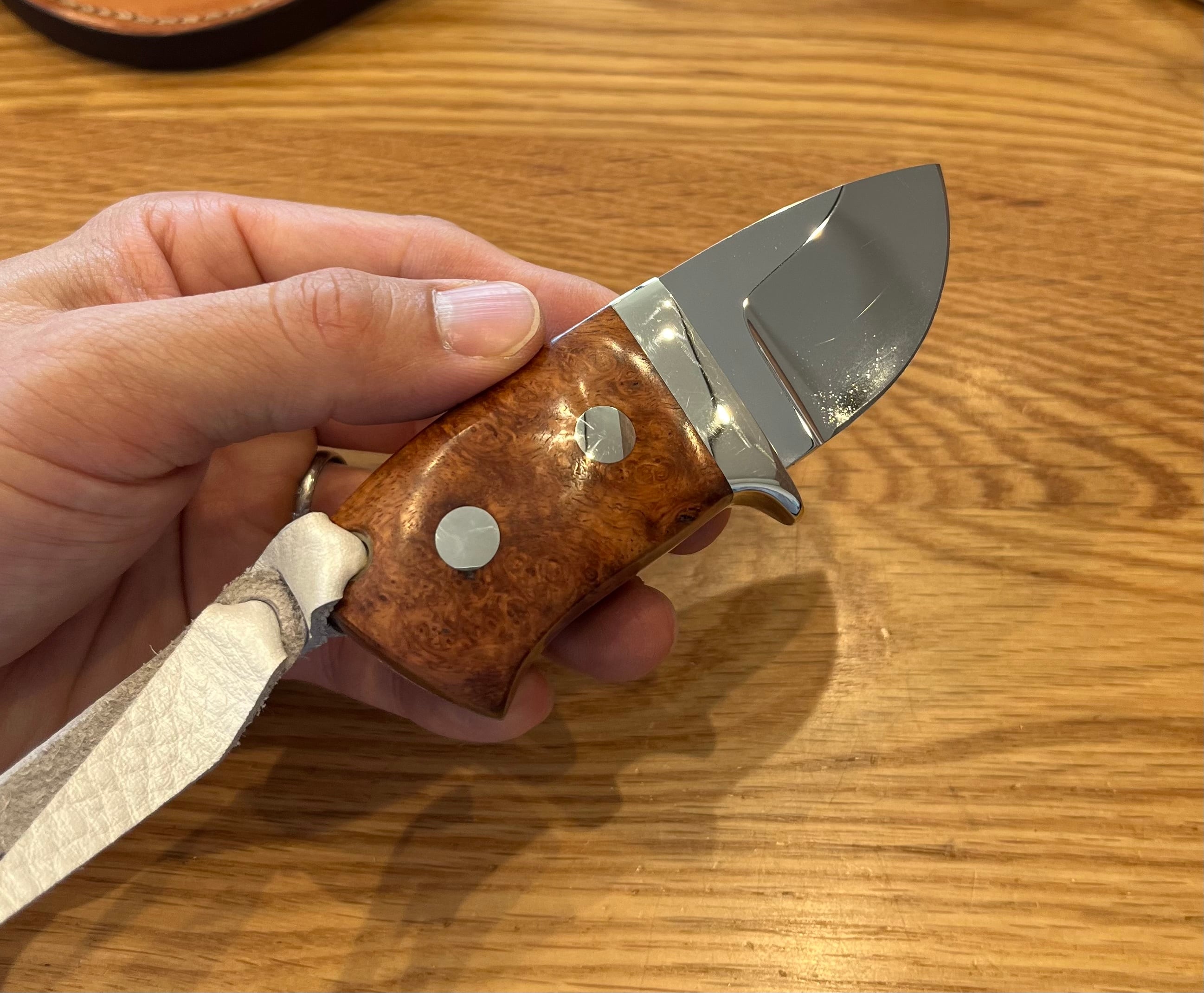 デフォルメミニチュアナイフの第一人者であり、JKGのベテランナイフメーカーでもある九鬼隆一氏の大変に可愛らしい作品。ラブレスの名作を完璧なバランスでミニチュア化しています。美しくみがかれたブレード、木目の美しいかりんこぶハンドル、極厚牛革の堅牢シース、専用かけ台と随所にこだわりが盛り込まれています。なかなか手がかかる作品のため、なかなか入手できないスペシャルカスタムナイフです。