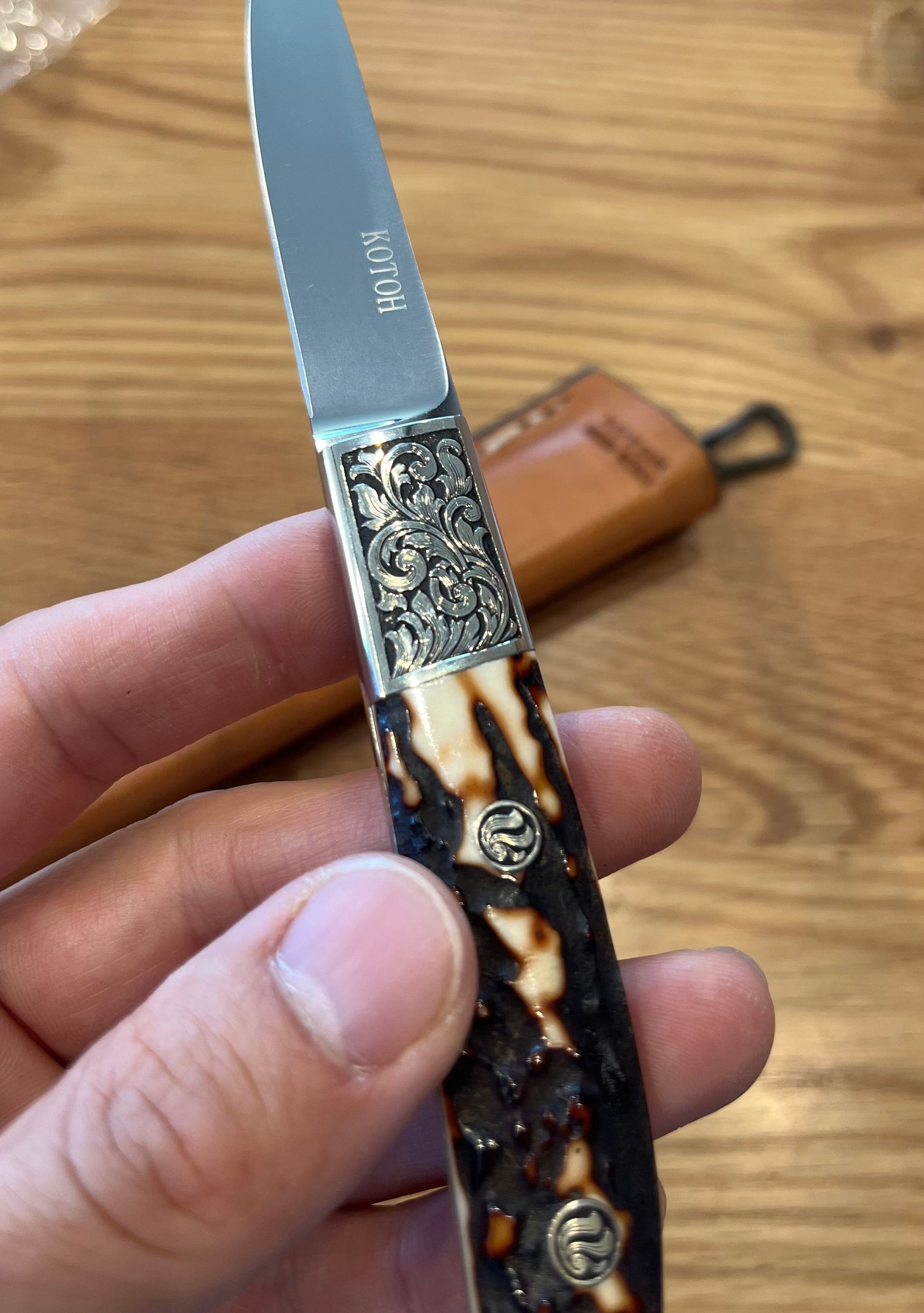 古藤好視氏が制作した最高級ナイフ。染め上げられた蝦夷鹿のハンドル、精密はエングレーブ。良い縫製のシース。どれも素晴らしいクオリティ。このコストパフォーマンスは圧巻です。エングレーブは国内トップクラスの技量を誇る石川氏。大変に希少価値の高い作品です。