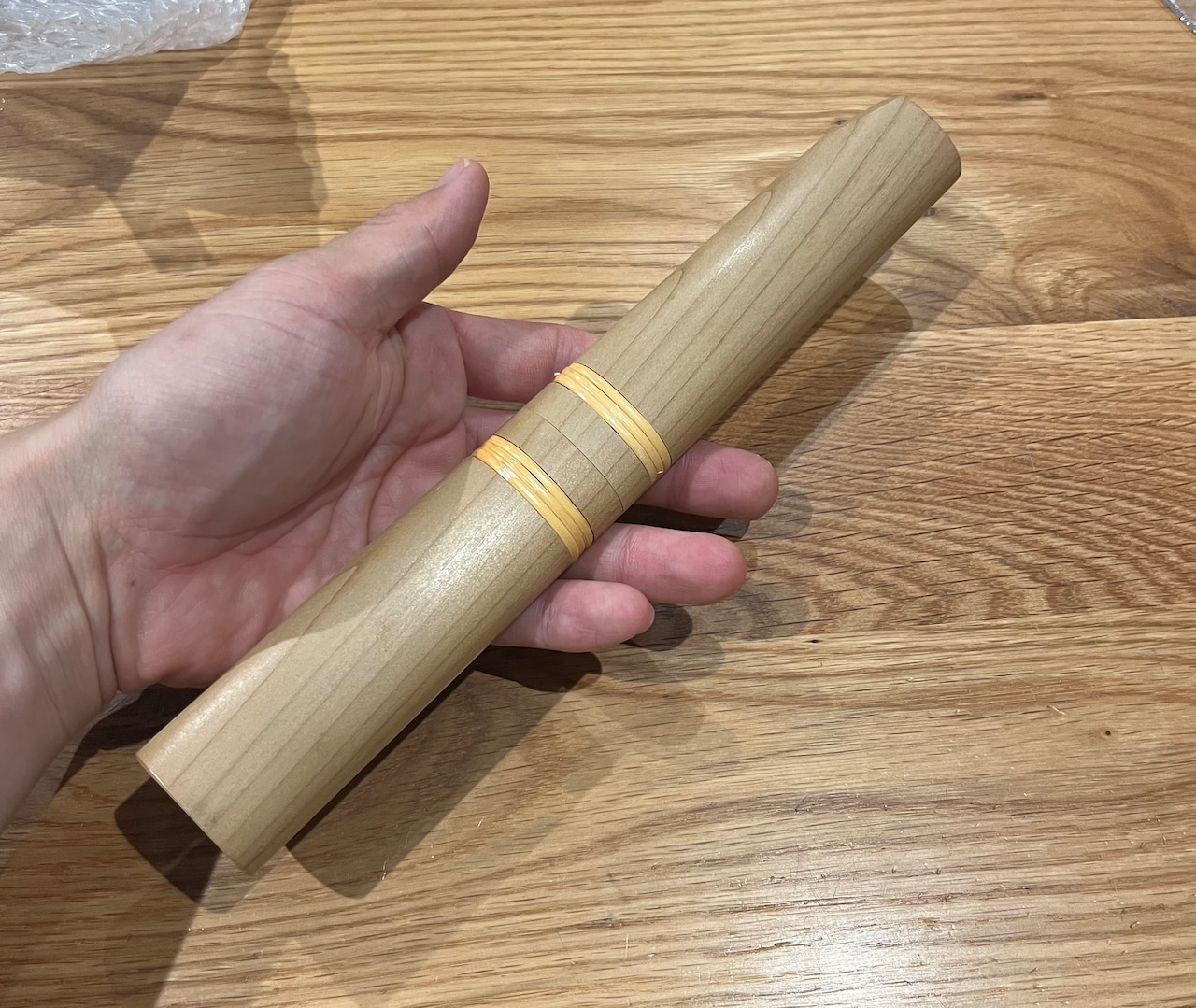 三条の和カミソリの大家で、三条鍛造界のレジェンド岩崎氏の切り出し木鞘誂造りです。昭和中期頃の作と推測されます。ご本人の作でしょうか。極めて希少な作品と思われます。
