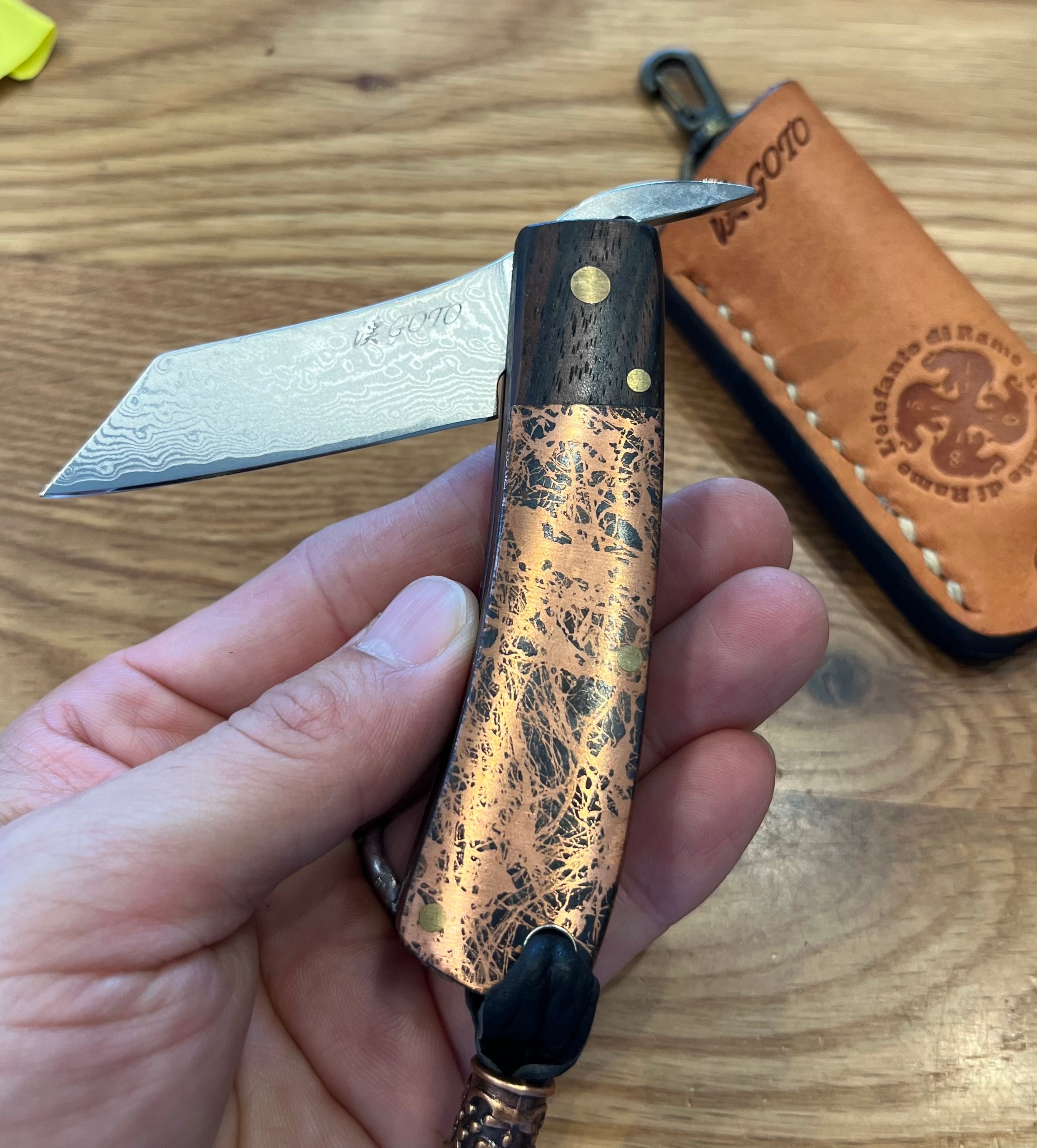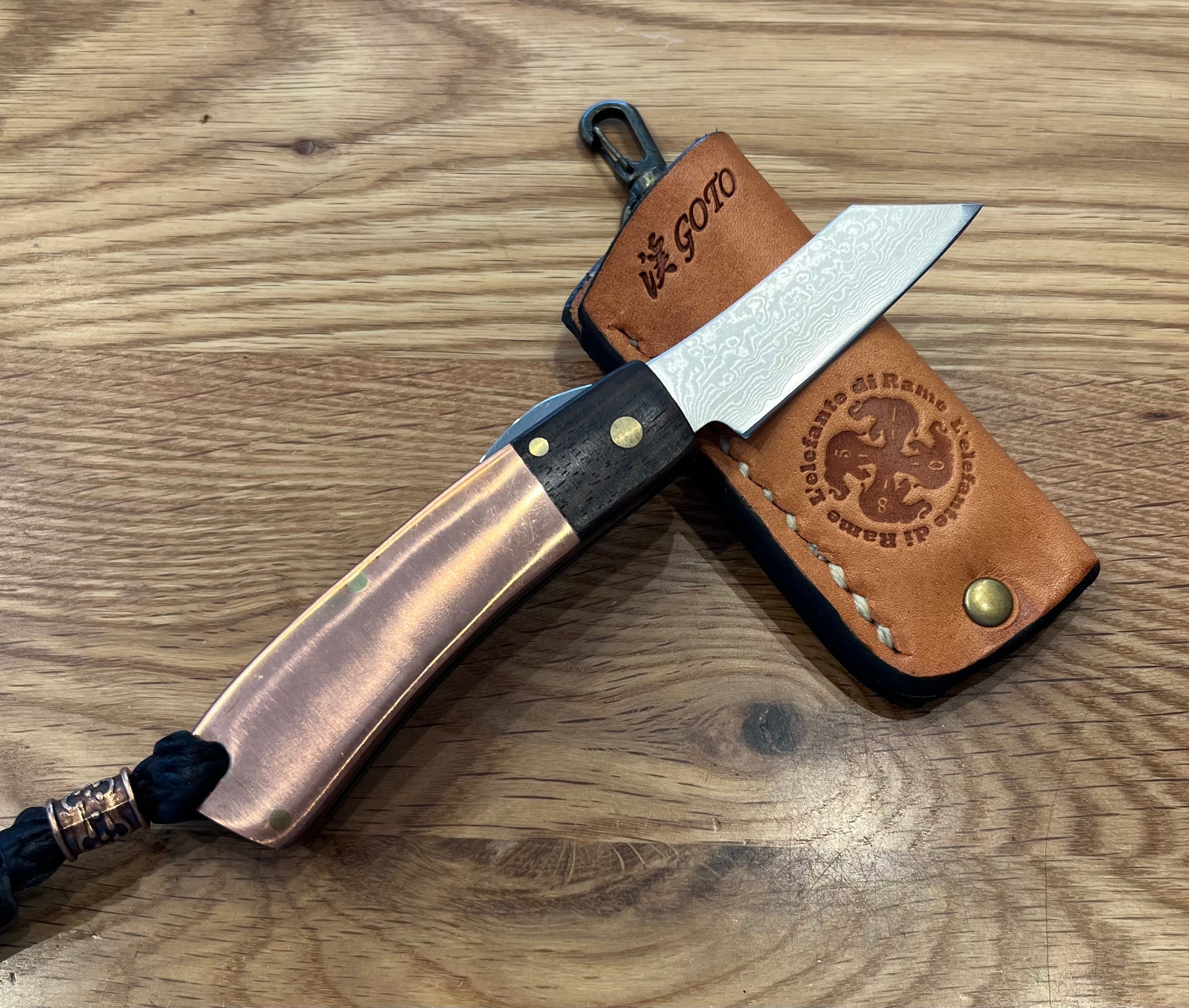 九州のカスタムナイフメーカー後藤渓氏か大手ブランドとコラボして製作した銅製ハンドルの日本式折り畳みナイフ。銅の加工があまりにもたいへんなため、本作のみで廃盤になった大変に希少なナイフ。革のケースのデザインが異なるものがあるため、特別アウトレットセール品。※銅ハンドルは傷や汚れがある場合があります。
