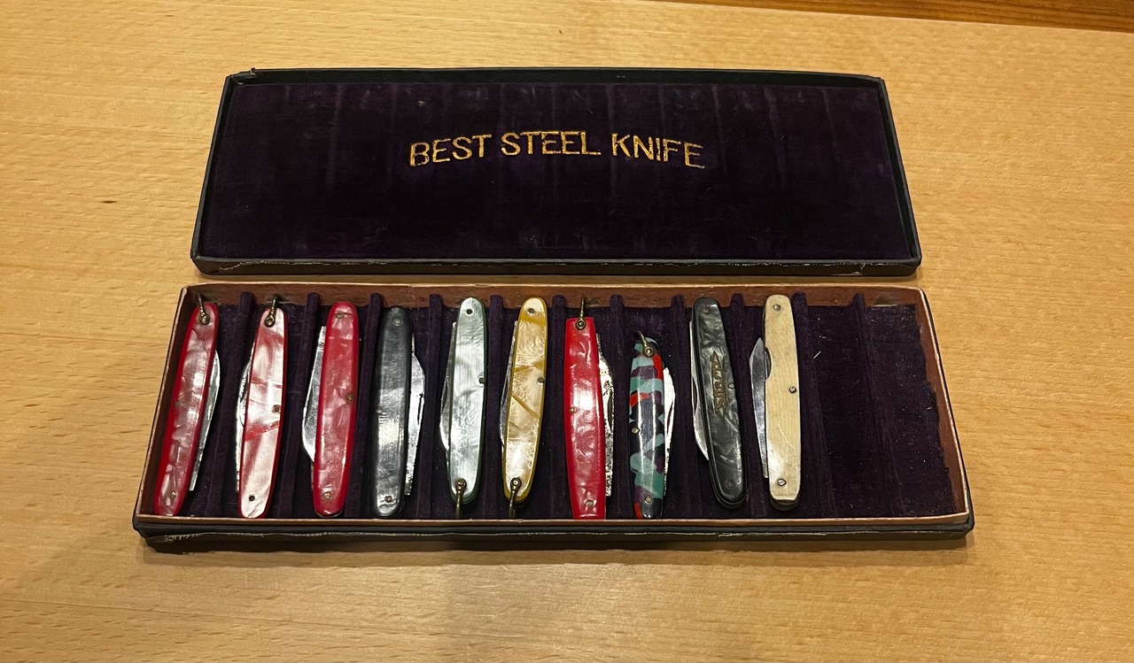 関が世界に誇るポケットナイフメーカー ベストナイフのセールスマンサンプルです。戦闘機の有機ガラスが余ったため、それらを使ったハンドルはまさに、この時代を象徴するものです。