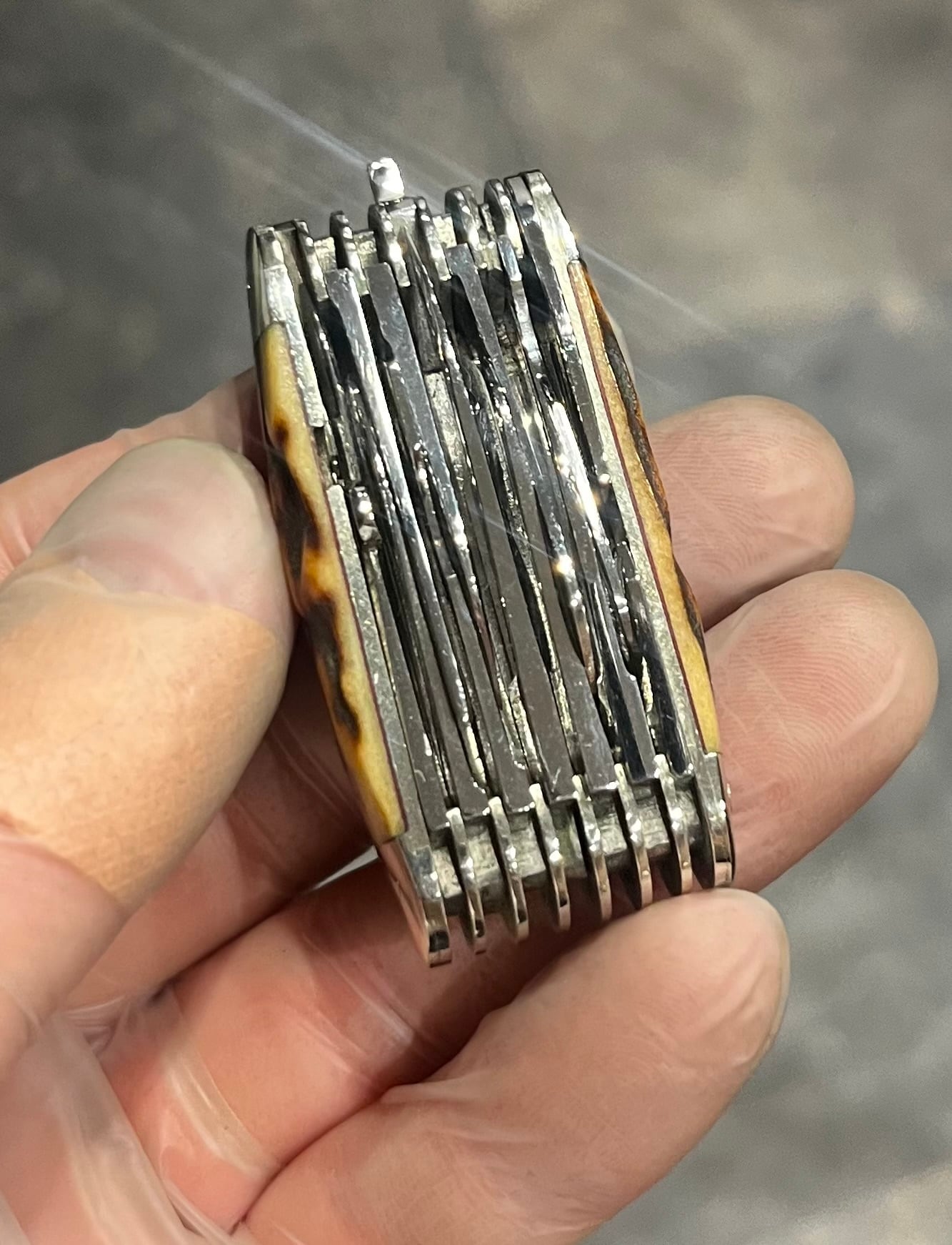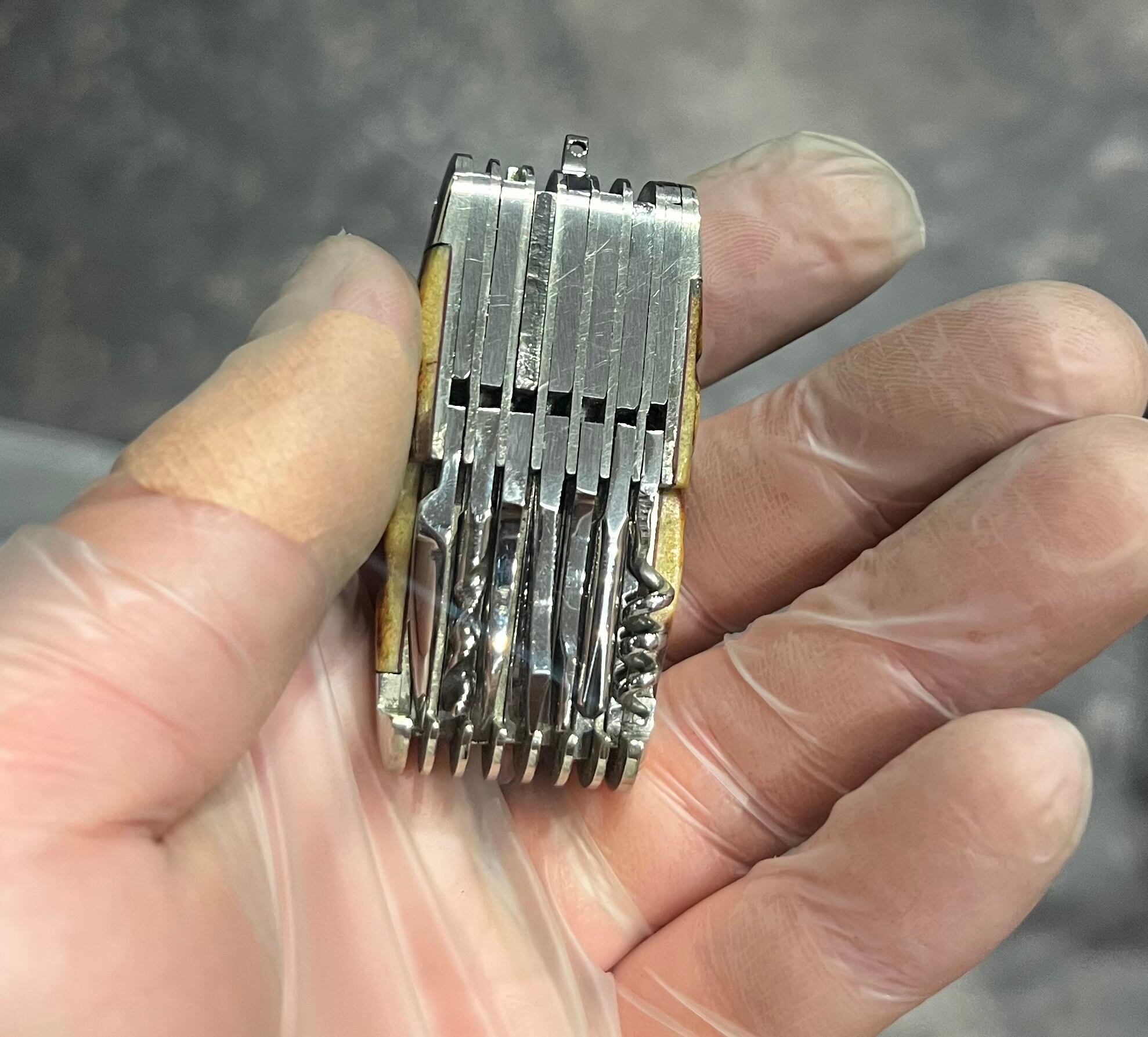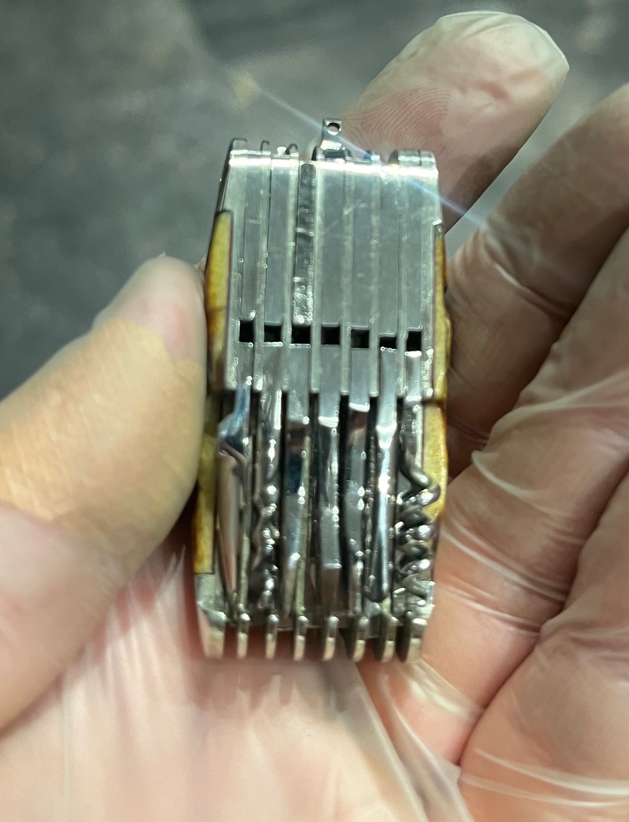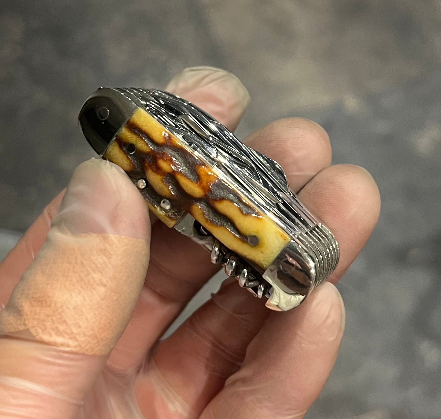 本品は藤本さんの作品ですが、バネ折れがあったので、鹿山さんに修理に出していたものです。晩年の鹿山さんは怪我で制作がほとんどできていませんでしたので、何年もかかるかも、、と思いながら気長に待ってきました。4〜5年ほど経ったときに鹿山さんはお元気かなーと思いなんとなく電話したら「あのナイフもうちょっとできるからね〜」ととても元気なお返事。「骨折してたところが痛いけど頑張っているよ」と尾骶骨と腕を怪我されながらも、作業しているとおっしゃっていました。さすがは生涯現役、、、すごいなと思いながら電話をきりました。それから3週間後、刃物問屋から電話が来て「鹿山さん残念だね、、」とのこと。「亡くなった??」まさか……。そんな…あんなに元気だったのに… 。まさに蒼天の霹靂でした…。最後はお風呂場で倒れられたとのことでしたが、直前までナイフ作業をしていたそうです。本当に生涯現役、まさに生粋の職人でした。鹿山さんの娘さんから、帰ってきたナイフはバネは交換されていて、あとちょっとでなおるとこでした。他の職人に頼んで仕上げようかなとも思いましたが、最後の最後まで職人だった鹿山さんのナイフっぽい気がして、仕上げずに残していました。完璧なナイフではないですが、とても素敵な一本です。